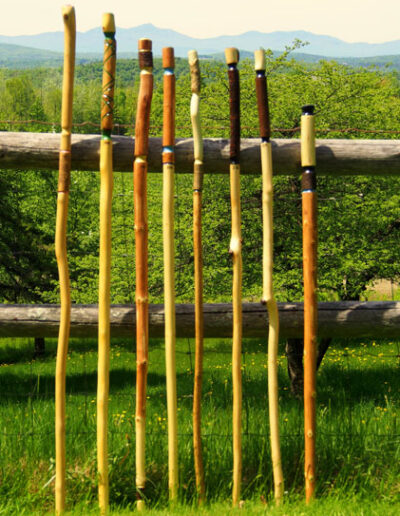 Years ago, while helping my sons with a Cub Scout project, I discovered a new calling: that of crafting decorative walking staffs. Since then I have made quite a number of staffs from many of the tree species native to northern Vermont. Each staff is individually numbered, attesting to its distinctiveness. My aim is to enhance the natural features of the tree – the twists and turns of the shaft, the bark, the grain, and the knots. After the saplings are cut, they are “de-barked”, (often leaving on bark “collars”), and then strapped to steel rods allowing the wood to dry without warping. The annular grooves on many of the staffs define the grip area, and provide comfortable resting points for the hiker’s hand as it moves up and down the grip. (I have found that grasping the staff in the lower area of the grip is helpful when hiking up hill, while moving the hand to the upper area of the grip eases steep descents). Simple, decorative embellishments are then made, each staff carefully sanded, and finally a preservative coat of varnish is applied.