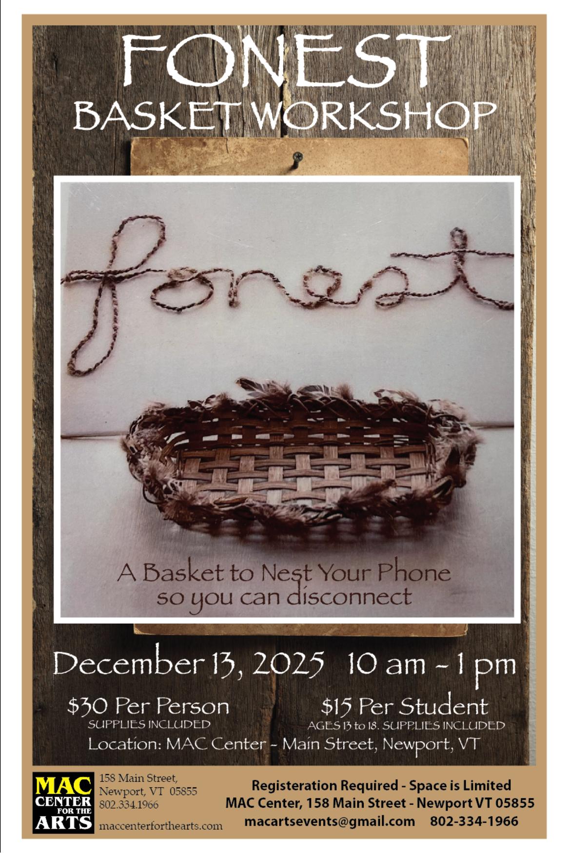 A basket weaving workshop with artist member Nathalie Clement will be held on December 13th from 10 am- 1p.m. at the Memphremagog Arts Collaborative (MAC) at 158 Main Street in Newport. All participants will have a finished woven “Fonest” basket in the Native American tradition of weaving to take home at the end of the workshop.